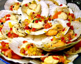 3.锅内放入油烧至六成热时,将鲜贝下入油锅内滑熟,倒入漏勺沥油;锅内留50油,下入花椒粉、姜米、蒜泥、红椒米、煸炒出香辣味,将滑熟的鲜贝复倒入锅内,烹料酒、随即冲下兑好的汁,翻颠几下,装在盘内,拼香菜即可。