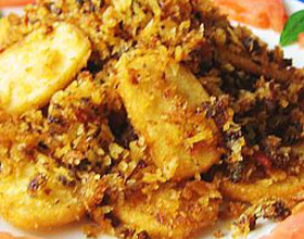 年年高升:'1.面粉加水调成面团后制成馄饨皮;2.将调味料调匀做成面糊;3.年糕切6厘米长段,放入面糊沾裹后,用热油炸酥外皮捞出,即成酥皮年糕;4.年糕切2厘米小...