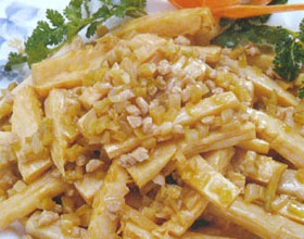 干煸冬笋:'1.将冬笋洗净,沥干水分,切成条;猪瘦肉切粒,榨菜洗净切粒。2.锅内注油烧热,放入冬笋炸至笋至淡黄色,捞出沥油。3.锅内留少许油,放入猪肉粒、冬笋...