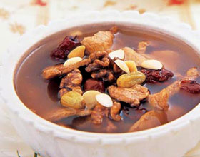 三子核桃肉益发汤:'1.女贞子、覆盆子、菟丝子分别洗净;2.核桃去壳略捣碎;3.瘦肉洗净原件下锅;4.全部材料共置瓦煲,加水8碗,煲至出味;5.加姜、盐调味,去渣,即可饮...
