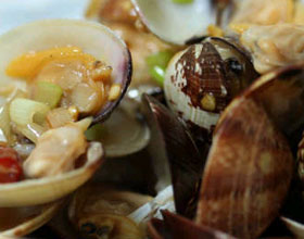 酱蛤蜊:'1.蛤蜊浸泡在倒有1大匙醋的水中,可帮助它吐尽泥沙;2.锅中倒入半锅水烧开,放入蛤蜊用小火汆烫至微张口时立刻捞出,放在盆中;3.大蒜拍碎,辣椒洗净...