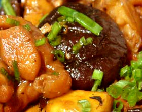 栗肉烧香菇:'1.用刀将板栗砍裂,放在沸水锅中煮透,使栗肉爆出,捞起,趁热剥壳去皮膜,洗净;2.香菇去蒂洗净后挤干水分;3.淀粉加水适量调匀成湿淀粉约20克,备用...