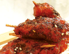 炸羊肉块:'1.用清水熬制丁香、豆蔻、砂仁、桂皮、小茴香、大料、草豆蔻、桂枝、陈皮、丹皮、高良姜、干姜、肉桂、枸杞子、白芷、胡椒制成调料液。2.将精选的羊肉...