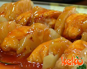 菠萝鸡:'1.柠檬取皮磨茸,肉榨汁,部分去核备用;2.将鸡洗净控净水分,用腌料搽匀,放姜蒸熟,约蒸20分钟,冷却后切块;3.菠萝切粒状,将碗用水沾湿,放3片柠...