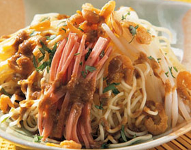 凉面冷盘:'1.火腿肉切成1厘米的正方形片;2.黄瓜纵切成4等份后,再切成薄片;3.番茄用热水烫过,去皮切碎;4.将酱油、香油、糖、盐混合,加热沸腾后,熄火待凉;...