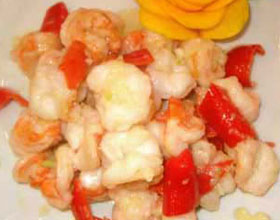 滑炒虾球:'1.中虾去头、皮、尾,由脊部片口挑去沙线,用盐、味精、料酒抓匀,加蛋清及水淀粉上浆备用;2.炒勺烧热加植物油,温油中将虾仁划出;3.白果、花菇和青...