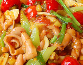 豉椒炒鹅肠:'1.将鹅肠用滚水飞至五成熟,滤去水分;2.辣椒洗净去蒂、去籽切成环状;3.大蒜去皮洗净剁成蒜茸;4.葱洗净切段;5.淀粉加水适量调匀成湿淀粉;6.用油起...    详细介绍