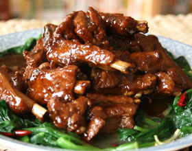年年高升:'1.小排骨先氽烫过,去除血水后冲净泡沫,沥干,放锅内,加入调味料(酒1大匙、醋2大匙、糖3大匙、酱油4大匙、清水2杯)烧开后,改小火慢慢烧至汤汁收...