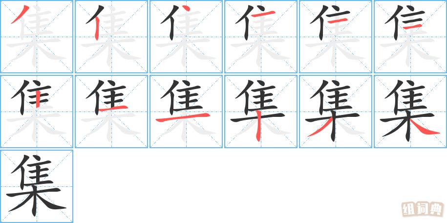 怎么写 此字《说文解字》篆形作「」,群鸟在木上也。从雥、木。重文省作「」。后世通行作「集」。楷书写法:上半「隹」四横笔皆接左竖;下半左撇、右点不接中竖,为「木」当下偏旁写法。「潗」、「磼」等字偏旁同此。