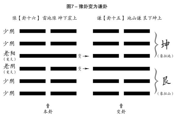 在这个变化当中,我们把豫卦叫做本卦,把谦卦叫做变卦。看,我们现在俗话里还常说的“变卦”就是从这儿来的。