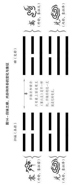 ——这种看卦方法我在前边已经讲过了。归妹卦是属于六十四卦系统里的,从下到上一共六根爻,这六根爻的下面三爻构成了一个八卦系统里的兑卦,上面三根爻构成了一个八卦系统里的震卦。《易经》里写成:“归妹,兑下震上。”在下面的兑卦叫做“内卦”,在上面的震卦叫做“外卦”。其他的卦也都是这个规矩,可以看成“内卦”和“外卦”两个部分。