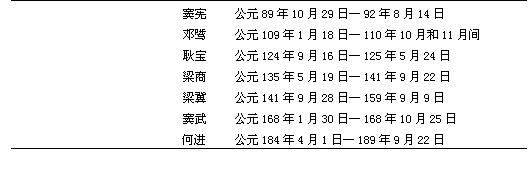 在国内战争时期,大将军的头衔被授给突出的军事将领,但后来就被免除了。公元89年重新采用这个头衔时,它已经成为摄政的同义语。第一位和最后一位大将军在行使政治职能的同时指挥着军事征战。其他的大将军则与军事事务不相干;他们在政治上被任命,以皇帝的名义控制庆祝。如表14所示,[9] 后汉时期有七位这样的摄政掌权。大将军的品级与三公相同,但权力比三公大。他在洛阳的官署实际上成为按照习惯分成若干个曹的主要机构。