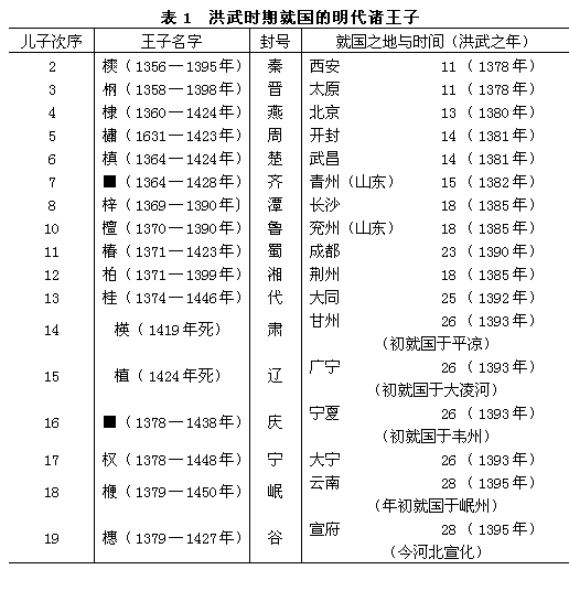 洪武帝虽然能够很轻易地消除这些将领,但要管理好王子们却是一件要棘手得多的事。他早在1369年就已经开始考虑这个问题,同时他还考虑让他的王子们代皇帝管理后备军事力量,和在边境上做保卫国土的封建领主。1395年10月3日他把《祖训录》的修改本分发给了官员们,又在11月12日把最后的定本分发给诸王子。与此同时,他宣布削减王子们每年的俸禄。[105] 最高的俸米从5万担削减到1万担(不包括补助的津贴在内)。《祖训录》在管理诸王子的条例方面有重大的改动。在皇帝的26个儿子当中,17个儿子在皇帝生前纷纷出而就国,两个死于1390年——一个是自杀的,另一个死于道教的丹药(见表1)。[106]