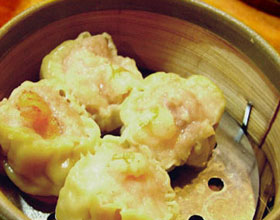7.在蛋皮中间放入虾馅1份,用筷子把蛋皮挑起翻折成半圆形,然后,再用筷子贴着馅心稍上处夹成烧麦形,放在盘中,在蛋皮合口处放上虾茸,缀上红椒末、青菜末,上笼用旺火蒸约10分钟到熟,取出;
