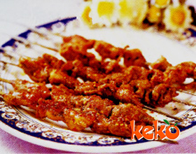 7.将肉串放在烤煸上(一个挨着一个摆放),先烤一面,边烤边撒上,辣椒面、精盐和孜然;