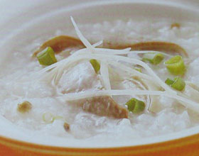 4.把猪肚切成细丝,放入粥内,加入盐、味精调味即可。