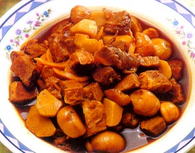 3.取另一锅加花生油少许,入牛肉、山慈菇、板栗、姜末一起翻炒,再加入适量料酒、酱油、精盐、糖和汤,烧到肉酥,出锅即可。