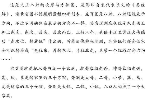 我们的身体也包含着一套八卦,乾是头,坤是肚子,震是脚,巽是大腿,坎是耳朵,离是眼睛,艮是手,兑是嘴。我总觉得这像是土匪的黑话,比如咱俩遇到条子了,我招呼你:“兄弟,你攻他乾、坎,我踹他坤!”街头看见MM:“嘿嘿,这小娘子的离和兑很靓呀!”