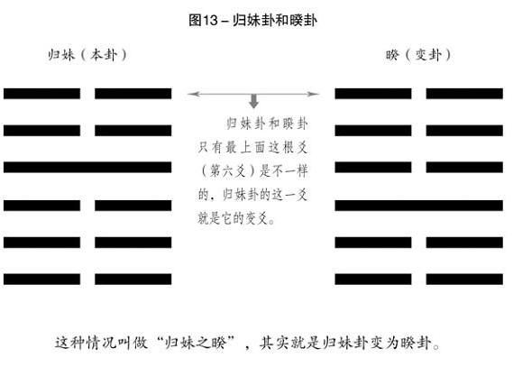 这是两个卦,我们可以把“归妹”看作本卦,把“暌”看作变卦。仔细看看,归妹卦和暌卦长得很像,只有最上面那根爻(也就是第六爻)不一样。睽卦最上面的是阳爻,归妹卦最上面的是阴爻,这根爻我们把它看作变爻,那么,根据前边讲的规矩,“归妹之暌”需要用归妹卦第六爻的爻辞来判断吉凶。
