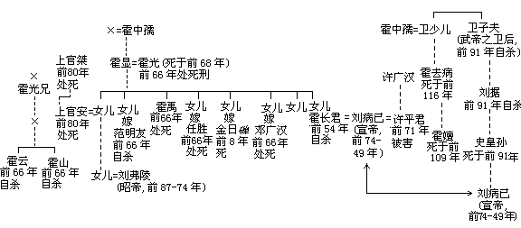 这时霍家充分地注意到了所处的严重的危险境地,并且知道唯一的生存机会是谋反。搞了两次阴谋,一次是谋害丞相,另一次是废黜皇帝而以霍禹代替。这两次企图都得到了以皇太后名义颁布的诏书的支持;太后为霍光的外孙女,她的诏书在公元前74年曾被非常有效地利用过。但这一次霍家却不走运。阴谋的消息泄露了;霍家的主要成员被清除,他们或是被处决,或是自杀。霍显之女作为皇后在霍家所有成员中似乎最有实力,但也被废(公元前66年9月)而搬出皇宫。只有霍显的外孙女,即未满25岁的昭帝的遗孀获准免于一死;她最后死于公元前37年。