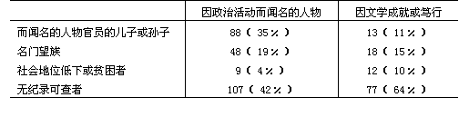 在大多数其他传记中,没有记载人物背景;只在少数场合,个别人物似乎出身于社会地位显然低下的家庭,或者出身于非常贫苦的家庭,以致必须干活才能求学。甚至在120篇因学识、品德、文学才华或独到的思想而被称赞的人物的简短笃行传中,只有5篇似乎是上升到社会上层的真实范例。[23] 在这批人中和在政治上活跃的集团中,其他一些人物被描写为穷人,特别是贫穷的孤儿,但这种贫穷常常只意味着他们必须耕种自己的田地,或者必须替别人干活,指出这一点是因为这证实了他的非凡的决心。
