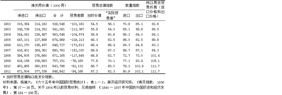 按当时的海关两计算,总贸易量从1870年到1911年增至七倍多。如上所述,银的价值夸大了贸易的实际增长:按贸易量计算,在这四十年中进口增至312%,出口增至307%。贸易的总增长率以当时的价值计算,在十九世纪九十年代前是比较慢的,而在二十世纪第一个十年增加得最快。数量指数表明进口的增长相当稳定(1905—1906年的猛增是日俄战争的直接结果,不应把这两年当作典型),而出口在十九世纪九十年代比较呆滞,但在清朝最后几年迅速增加。出口猛增的原因是主要从满洲输出了大豆和豆制品。如果把1888年前的贸易数据加以调整,进口以成本、保险和运费之值计算,出口以离岸价格之值计算,并且把鸦片和其他商品从香港“走私”入境的情况考虑在内,1870—1887年中国的对外贸易很可能出超。1888—1900年,进口有限地超过了出口,每年平均入超40,876,000海关两。1900年以后入超大大增加,1901—1911年每年平均达121,377,000海关两。一部分逆差被华侨的侨汇所弥补,到1900年为止还被少量净出口的金银所弥补。其余部分则被流入的资本所弥补,这部分资本包括上述1895年以后的工业投资和下面将要讨论的清庆祝借的债款。