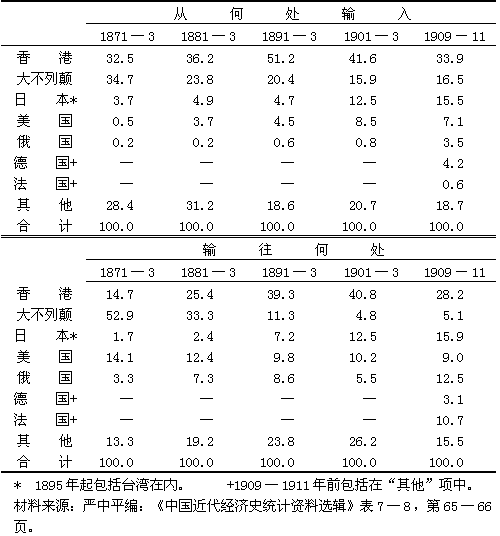 香港名义上占中国对外贸易数量的很大部分,却又缺乏1932年前从香港输入和输至香港的货物的数据,这样就不能精确说明与各国进行贸易的比重。表十九提供了1871—1911年期间选择的几年每个国家在中国对外贸易中所占的未经调整的百分比,而表二十则显示了马士为帝国海关计算的每个国家的百分比,他的计算把香港作为一个中国港口,它的进口数和出口数分别被列入表内几个主要贸易国家的数字中。联合王国在十九世纪末之前是中国最重要的贸易伙伴——如果拿整个英帝国来考虑,那么在进入二十世纪后它仍是最重要的。英国在中国进口贸易中的优势最为显著,如上所述,这是因为从兰开夏进口了棉布,从印度进口了棉纱和鸦片。虽然英国的总的比重依然是最大的,但也在减少。从十九世纪九十年代起,日本的贸易由于受到了马关条约的条款和1905年以后它在满洲所起作用的推动,发展很快。美国和俄国在中国的贸易中所占的比重总的说是在增加。