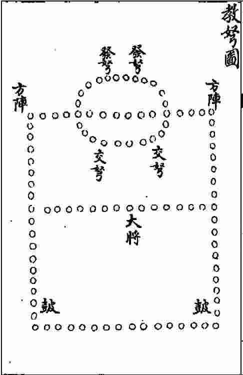 。左校以青龙旗表之,右校以白虎旗表之,中校轩辕大将所处。左鼓右旗,四阵普同。谓之一队者,三十五人。一部者,二十队也。每一校不常其部,各列阵数应敌之势,贵战斗之际前后不相交乱也。飞鹗阵,前校出首骑者,所以为重也。前出一部为觜,次四部为面,余五部包之于首。左右校出骑兵者,内以副身,外以副项及首也。夫鹗以搏击为俊,故阵欲觜爪之利焉。重霞阵,卫其不动,即分两穗从旁击焉。敌若惊乱,前校骑兵两穗进击。步士则不可轻进,但在本处受战。若前冲骑退即前校骑兵进,前校骑兵退即前冲骑兵进。夫云霞以开阖进退不常其法,故前校骑兵往来氤氲以象之也。长虹阵及八卦阵,皆有冲实。外以安敌之不意,内以卫大阵也。夫长虹以为名者,取阵形弯前扼敌之势。八卦以名之者,取八面受敌之象也。凡四阵逐步结阵之法,横七队为首,横七队为身,横六队为尾。部兵每一部横七十步,首横七十步,厚十步,身亦如之,尾横六十步,厚十步。身去首二步,前后并同。骑兵每一步横一百四十步,厚六十步八步,首横一百二十步,厚二步,身亦如之,尾横一百二十步。身去首四步亦如之。受战之时,大阵不可辄动,敌众未薄则大敌离。于是三令五申:白旗点,鼓音动,则左右厢齐合;朱旗点,角声动,则左右厢齐离。合与离皆不离中央之地。左厢阳回而旋,右厢阴回而旋,左右各复本位。白旗掉,鼓音动,左右各云蒸鸟散,弥川络野,然而不失部伍之疏密;朱旗掉,角声动,左右各复本位。前后左右,无差尺寸。散则法天,聚则法地。如此则三合三离,三聚三散。不如法者,吏士罪之,务从军令。于是大将出五彩旗十二口,各树于左右厢阵前。每旗用壮勇士五十人,夺旗者胜,失旗者负,胜赏而负罚。离合之势,聚散之形,胜负之理,赏罚之信,因是而教之。