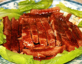 '1.将牛肉选好切成10厘米长、2.5厘米宽、0.3厘米厚的肉条,整齐地码放盘中;