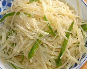 2.炒锅置火上,烧热后注入花生油,四成油温时下入土豆丝翻炒二下后下入醋,接着下入精盐、味精、葱油、花椒油、葱丝翻炒成熟即可出锅装盘。