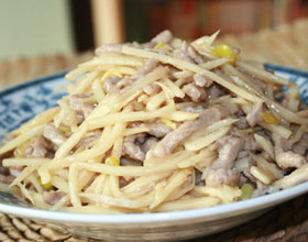 '1.将牛肉洗净,去筋膜,切成薄片,顺纹切成丝;