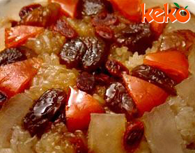八宝饭:'1.将青梅、核桃仁切成小丁;2.山楂糕切条;3.猪板油温水洗净切条待用;4.将糯米拣净杂质淘洗后,在锅里加水500毫升烧开,放进白糖,再将洗净的糯米放...
