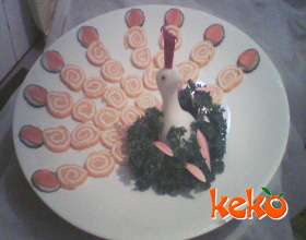 孔雀迎宾:'1.鸭肉(鸭脯肉)洗净,放入由油、米酒、水、盐、葱、姜、糖、八角、桂皮、花椒、丁香、草果等调好的卤汁锅中,卤熟,备用;2.香菇去蒂,洗净,照此法...