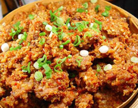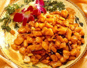 宫保鸡丁:'1.鸡去骨,切成1厘米见方的碎丁,用鸡蛋清、盐10克、生粉10克腌拌均匀。2.色拉油入锅烧热,鸡丁下锅炸熟,捞起沥油。3.锅中留油少许,香干辣椒段、蒜...