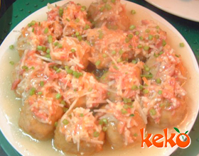 干贝绣球:'1.将干贝水发后,再用蒸笼蒸约10分钟,蒸熟后撕成丝状;冬菇泡软去蒂,与红萝卜、芥兰菜均切成细丝;然后将鸡胸肉、虾仁、荸荠、猪板油搅拌均匀铺平。...