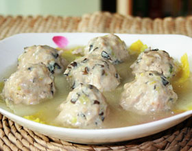 2.将第一步骤中的原料混合一起再加入调匀的鸡蛋、精盐、味精、胡椒粉、醋轻轻调匀,做成10个丸子,放汤盘中入笼蒸8分钟,熟后取出。