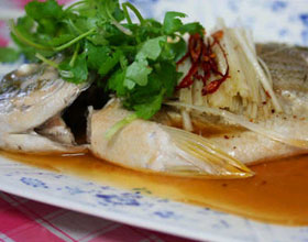 9.将炒锅内放汤旺火烧开,打去浮沫,浇在鱼身上,淋上鸡油即成。
