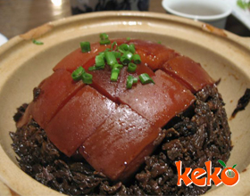 6.取扣碗1 只,先放少许煮过的干菜垫底,然后将肉块皮朝下整齐地排放于上面,盖上剩下的干菜;