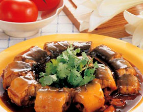 枸杞炖河鳗:'1.将河鳗放进开水中稍氽烫,待其外皮变成白色时,取出;2.洗净粘膜,切约3公分长的段;3.将河鳗放进盅内,加入枸杞、黑枣、红枣、当归、白酒、盐及水...