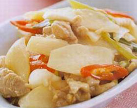 山药炒肉片:'1.山药洗净刮去皮,竖切两半切薄片,放沸水中焯出。2.里脊肉切薄片,放碗中加盐、蛋清、水淀粉上浆,放温油中划出。3.滑勺内加植物油烧热,放入葱丁煸...