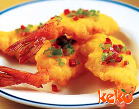 干煎虾碌:'1.将净大明虾切成段;2.用茄汁、?汁15克、香油、精盐、味精、白糖调稀成芡汁,约100克;3.旺火烧热炒锅,下油烧至微沸,放入虾段炸约1 分钟,用笊篱捞...