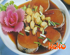 侉炖鱼:'1.把鱼放在开水内烫一下捞出,刮去全身的浮皮,洗净剞上交叉的斜刀口;葱、姜均切成块;冬笋、香菇均切成片;肥膘肉剞成交叉花刀。2.勺内放猪油,用葱...