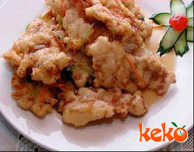 京包里脊:'1.顶刀将猪里脊切成椭圆形的片,用精盐、味精、黄酒腌渍后沾上面粉;2.玉兰片、冬菇、油菜都洗净切成小菱形片;3.葱、姜切细末备用;4.将鸡蛋清打成蛋...