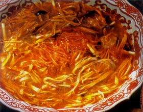 鲍鱼四宝羹:'1.花胶(鱼肚)泡冷水1小时,捞出,放姜、葱及清水煮约1小时(需视厚薄程度而定),取出切丝;香菇泡软去蒂后切丝,鲍鱼、竹笋、木耳、韭黄、叉烧肉均切成...