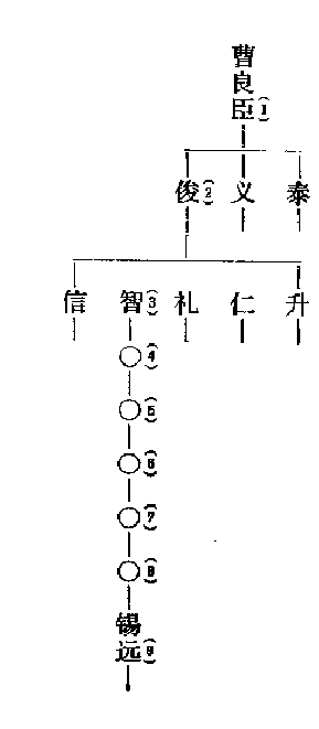 总起来说,共有两点:一、对四房曹智系下五世不明、突接锡远的情形,未有参证之前,仍持存疑态度;二、锡远以下至天祐这部分的本身,不同虚构伪造,基本上应属可信。各种资料的情形,往往异常复杂,必须分析申辩;轻信轻疑,因个别点有异而疑及全部,见某一端近似而信赖整体,皆可造成研订上的大错误。为避繁文,只简说如上;餘者可略参第三章第二节后的附记。