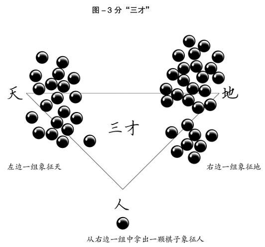 不错,从任意一组当中拿掉1颗棋子(也有人说只能从象征地的右边那一组里拿),这颗棋子象征的就是人。这样一来,天、地、人,全都有了,我们的祖先管这三种东西叫做“三才”。