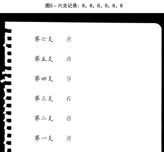 好了,我们现在假装已经演算了一遍又一遍,依次算出了从第一爻到第六爻,我们在纸上的记录由下向上分别是六个数字:8,8,6,9,8,8。