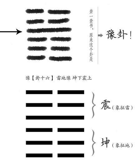 这四种爻是和6,7,8,9四个数字一一对应的:6是老阴,8是少阴,7是少阳,9是老阳。再拿方才那个豫卦为例,如果仅以阴阳二分法来看,这一卦的构成是:“阴,阴,阴,阳,阴,阴”(六爻从下往上依次来看),可要按这个四分法来看,它的构成就变成了:“少阴,少阴,老阴,老阳,少阴,少阴”。(8,8,6,9,8,8。)