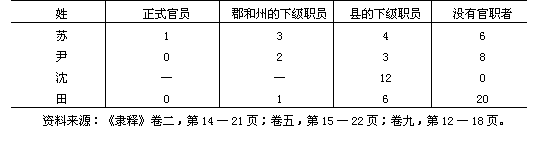民用铭文很少详细说明人们之间的亲属关系,但是,往往有那么多同姓人,以致能够合理地推断出某种亲属关系。例如,在作为对一位被调职县令表示敬意于公元186年建立的碑刻发起人而列举的41人中,有26人姓韦,12人姓范。[34] 这样的县级工程发起人名单总共有11份,而且除了其中两份外,至少有一个家族的姓经常出现;在其中四份中,有一个家族的姓占这些名单中的姓的20%以上。在有100多个姓的三份名单中,每份名单都证明几家名门以及同一姓的官员、下级官员和非官员同住一地。例如,为对一位县令表示敬意而于公元185年建立的一块碑刻的157名发起人中,24人姓李,14人姓苏,13人姓尹。[35] 表18的数字表明四个地方亲属集团中存在着官员、下级官吏和没有官职的人。[36]