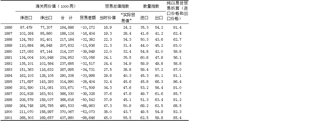 按当时的海关两计算,总贸易量从1870年到1911年增至七倍多。如上所述,银的价值夸大了贸易的实际增长:按贸易量计算,在这四十年中进口增至312%,出口增至307%。贸易的总增长率以当时的价值计算,在十九世纪九十年代前是比较慢的,而在二十世纪第一个十年增加得最快。数量指数表明进口的增长相当稳定(1905—1906年的猛增是日俄战争的直接结果,不应把这两年当作典型),而出口在十九世纪九十年代比较呆滞,但在清朝最后几年迅速增加。出口猛增的原因是主要从满洲输出了大豆和豆制品。如果把1888年前的贸易数据加以调整,进口以成本、保险和运费之值计算,出口以离岸价格之值计算,并且把鸦片和其他商品从香港“走私”入境的情况考虑在内,1870—1887年中国的对外贸易很可能出超。1888—1900年,进口有限地超过了出口,每年平均入超40,876,000海关两。1900年以后入超大大增加,1901—1911年每年平均达121,377,000海关两。一部分逆差被华侨的侨汇所弥补,到1900年为止还被少量净出口的金银所弥补。其余部分则被流入的资本所弥补,这部分资本包括上述1895年以后的工业投资和下面将要讨论的清庆祝借的债款。